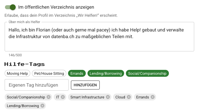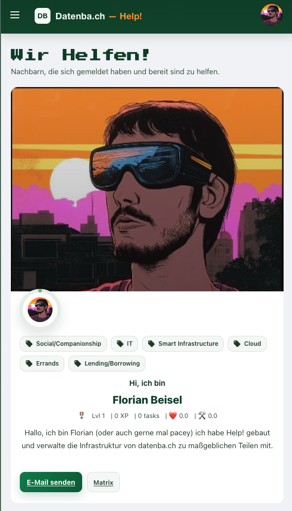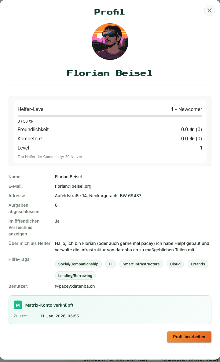 Achtung: Im Moment ist die Helfer Gallerie öffentlich mit allen Informationen einsehbar. Dies ist eine Design-Entscheidung um auch Fremden (s. Klaus) einen Überblick über Helfer zu bieten.