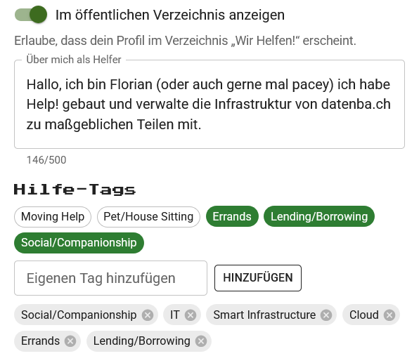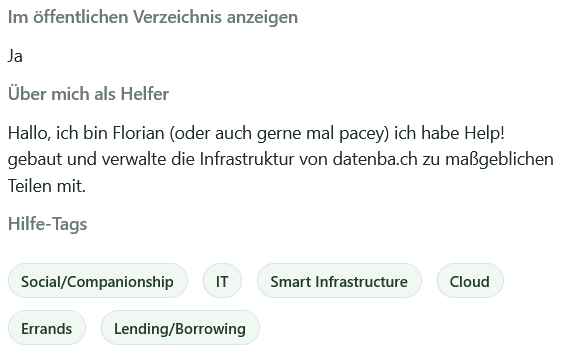 Diese Einstellungen sind nur relevant wenn du vorhast im öffentlichen Verzeichnis der Helfer-Galerie aufgelistet zu werden. Hier siehst du übersichtlich den Status: ob du angezeigt wirst oder nicht die von dir hinterlegte kurze Selbstbeschreibung die in der Galerie angezeigt wird und die Kategorien bzw. Hilfe-Tags die du anbieten möchtest.