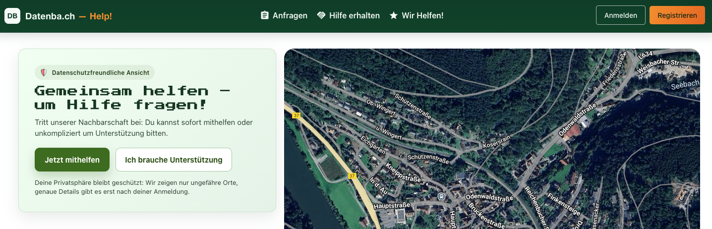 Wenn ihr keinen Fehler gemacht habt werdet ihr jetzt zur angemeldeten Übersichtsseite weitergeleitet. Dort könnt ihr Hilfsgesuche erstellen, Gesuche lesen, Einstellungen Tätigen und vieles mehr.